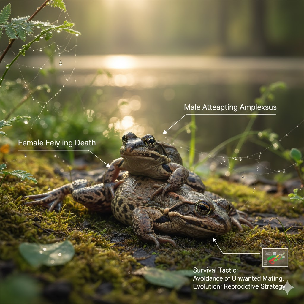 For many female frogs, the breeding season can be physically dangerous. Being swarmed by multiple males increases the risk of injury, exhaustion, or drowning. By pretending to be dead, a female may trick a male into letting her go — giving her a better chance to survive and reproduce later with a male of her choice.